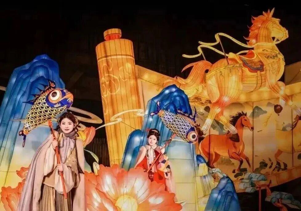 马跃千年迎新岁,灯映莒地话古今。三十余组莒文化主题花灯,是这场灯会的灵魂所在。每一盏灯都是一个故事:有的讲述莒国古城的建城传奇,有的再现昔日市井的繁华喧嚣,还有的将民间传说化作可视的浪漫。特别是“万马奔腾”卷轴式灯组前,总是围着最多的人——骏马昂首扬蹄,寓意着新岁奔腾、万事顺遂。