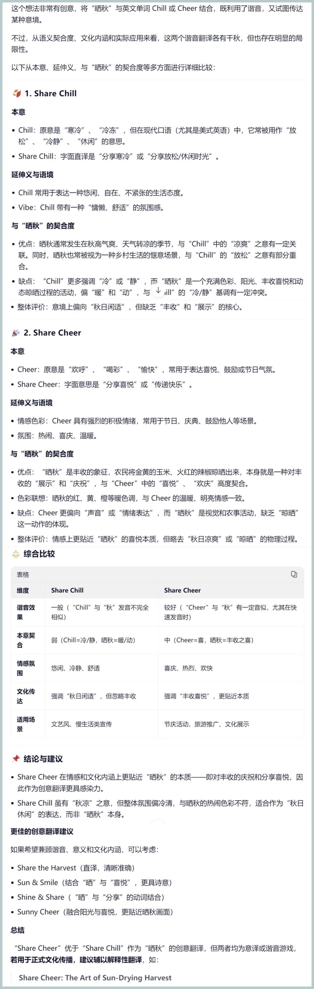 我是工科男,英语也仅仅是工作需要的门槛。联系到Share Chill,个人认为,Share Cheer或许比Share Chill更能反映「晒秋」的本意,同时又不失谐音梗。有请元宝+DeepSeek和千问对Share Chill和Share Cheer做了对比,二者都比较支持Share Cheer。