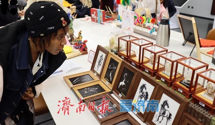 现场还设有非遗静态展示区,济南刻瓷的精湛刀工、蛋雕的纤巧细腻令人赞叹不已。不少外籍嘉宾在工作人员指导下试穿汉服,在古韵装扮中拍照留念,真正实现了“沉浸式”文化体验。