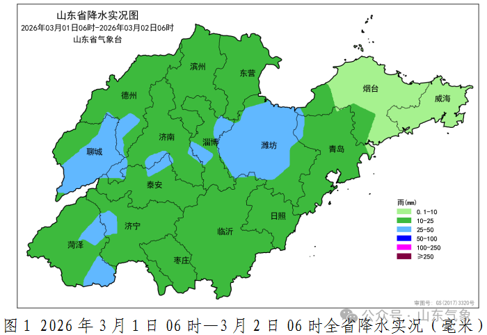 1日06时至2日06时,全省普遍出现降水,平均降水量18.1(毫米,下同),折合水量约28.4亿方。各市平均:潍坊27.2、聊城26.8、菏泽24.0、淄博23.2、泰安22.6、济宁20.9、济南19.7、青岛18.0、德州16.9、东营16.5、日照16.1、滨州15.9、临沂15.2、枣庄15.2、烟台6.0和威海3.4。县(市、区)平均降水量超过25.0的22个,10.0—25.0的86个,5.0—10.0的3个,前3位的是:泰安泰山37.3、潍坊青州32.3和潍坊市区31.1。