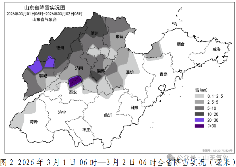 全省共有10市、55县(市、区)出现降雪,平均降雪量3.7。各市平均:德州13.5、聊城9.8、滨州8.6、泰安6.2、淄博5.9、济南5.3、东营4.9、潍坊1.7、烟台0.3和菏泽0.3,其他市无降雪。县(市、区)平均降雪量超过30.0的1个,20.0—30.0的2个,10.0—20.0的14个,前3位的是:泰安泰山37.3、聊城临清23.6和聊城高唐20.9。最大积雪深度排前4位的是:泰安泰山23厘米、德州本站12厘米、德州陵城12厘米和聊城冠县12厘米。今年以来全省平均降水量30.9,较常年同期偏多10.6(52%)。
