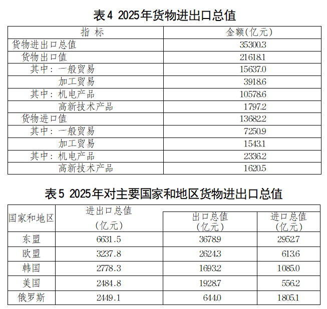 全年货物进出口总值3.53万亿元。其中,出口2.16万亿元,进口1.37万亿元。出口商品中,机电产品出口1.06万亿元,占出口总值的比重为48.9%。民营企业进出口2.69万亿元,占进出口总值的比重为76.3%。