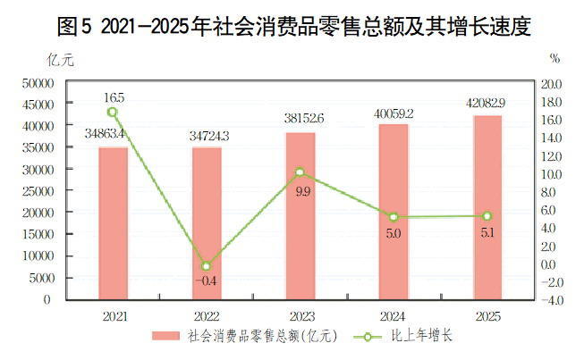 9.社会消费品零售总额统计范围包括:从事商品零售活动或提供餐饮服务的法人企业、产业活动单位和个体户。其中,限额以上单位是指年主营业务收入2000万元及以上的批发业企业(单位)、500万元及以上的零售业企业(单位)、200万元及以上的住宿和餐饮业企业(单位)。限额以上单位商品零售额增速、网上零售额增速按可比口径计算。根据第五次全国经济普查结果对社会消费品零售总额数据进行了修订,2025年社会消费品零售总额相关指标增速按照可比口径计算。