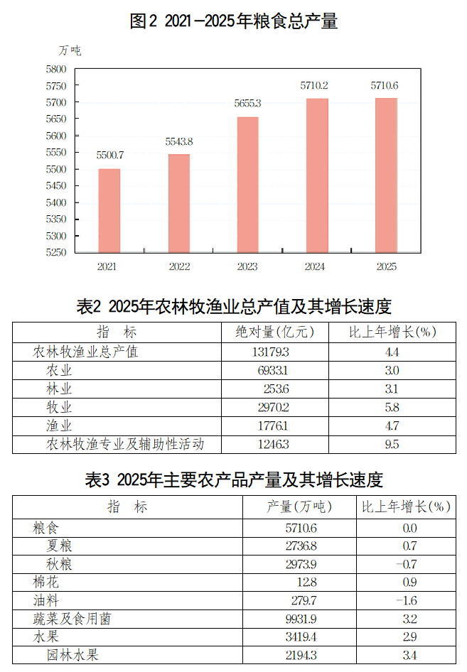 全年农林牧渔业总产值13179.3亿元,按可比价格计算,比上年增长4.4%。粮食生产总体稳定,粮食总产量5710.6万吨,比上年增加0.4万吨。