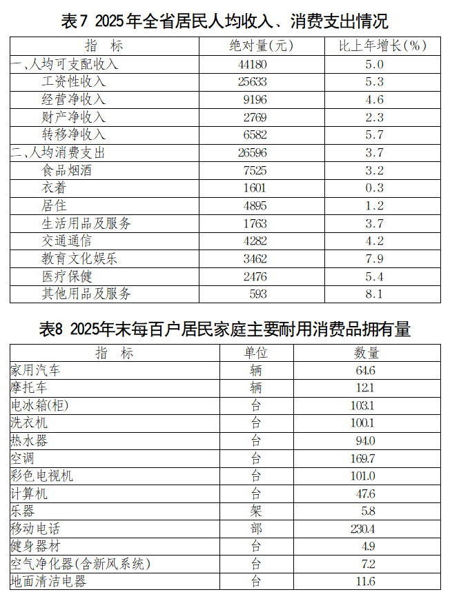 全年全省居民人均可支配收入44180元,比上年增长5.0%。其中,城镇居民人均可支配收入56444元,增长4.4%;农村居民人均可支配收入26613元,增长5.4%。全省居民人均消费支出26596元,增长3.7%。其中,城镇居民人均消费支出32561元,增长3.0%;农村居民人均消费支出18053元,增长4.6%。