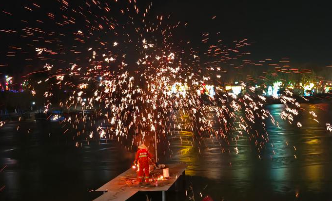 在凤栖湖畔,备受赞誉的“水上飞人”表演也将升级。白天,表演者脚踏喷射装置在湖面翻飞腾跃;夜晚,他们则化身“火舞使者”,手持燃烧的火壶上演震撼的“空中火壶”。火焰划破夜空,在水面倒影的映衬下划出绚丽弧线,呈现出堪比国家级非遗“打铁花”的视觉冲击力。据悉,“空中火壶”每晚将上演3场。