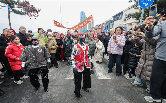 同日,威海多地民俗活报展演同步启幕。今年的表演队伍里,除了舞龙舞狮、跑旱船、耍毛驴这些“老面孔”,还迎来了机器人等“新成员”。它们扭着秧歌闪亮登场,其中两个央视春晚同款人形机器人格外吸睛,稳稳占据“C位”。它们踩着铿锵的锣鼓点,与活报队员默契同频,扭起地道的秧歌步,时不时秀出利落的武术动作,萌态可掬又飒爽十足,引得孩子们追着奔跑欢呼,游客们举着手机全程跟拍。