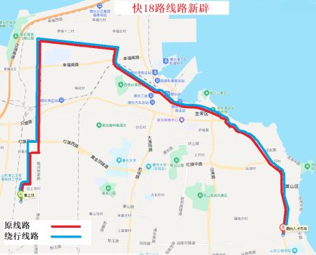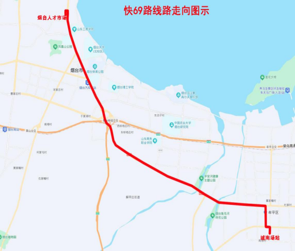由城南场站发车,沿通海路、工商大街、西关路、北关大街、G228、观海路运行至烟台人才市场。