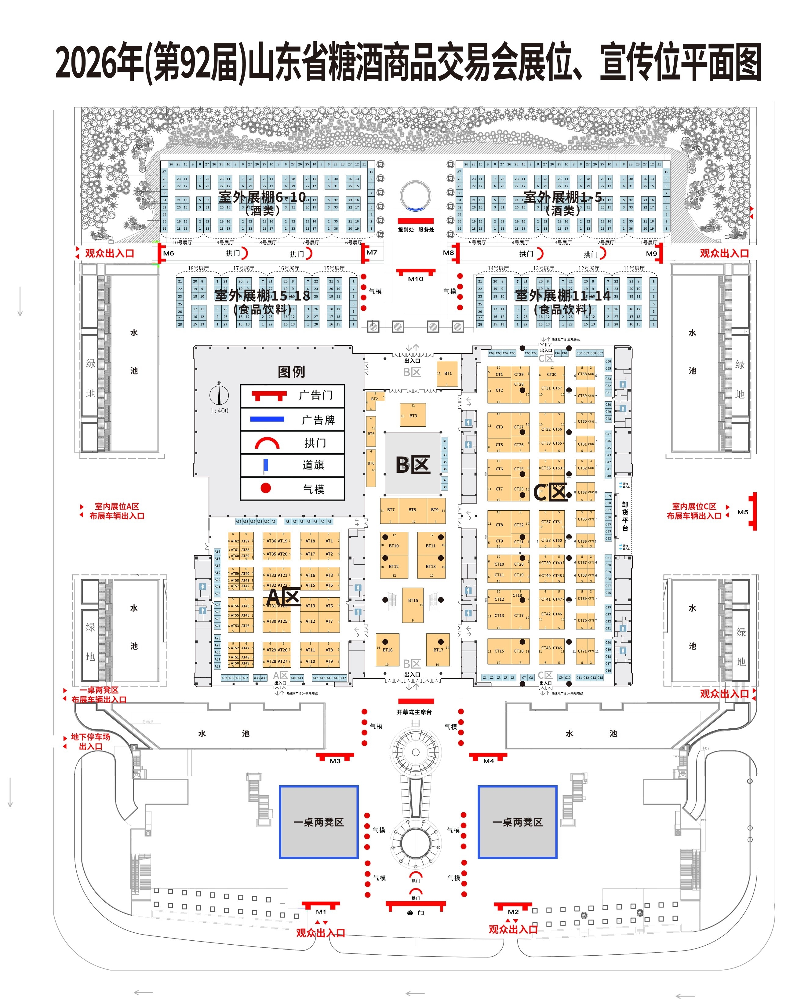 会议主会场设在泰山国际会展中心,规划展出面积5万余平米,其中室内面积2万余平米,室外面积3万多平米,共设A馆、B馆、C馆、室外展棚区、室外一桌两凳区、灌装设备区6大展区,设置特装展位150余个,标准展位近700个,桌凳展位600余套,灌装展位若干个,涵盖高、中、低多种档次、价位,展览面积和展位数量也与上届淄博基本持平,基本上能够满足不同企业、不同层次的各种参展需求。