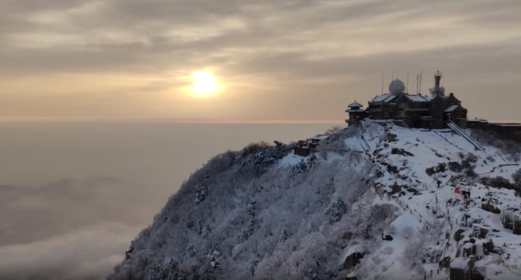 一场春雪过后泰山银装素裹如诗如画,漫步在泰山之巅仿佛步入了“天上宫阙”。远望山间波涛翻涌,所到之处一片纯白,宛如童话琉璃世界。(来源:闪电新闻)