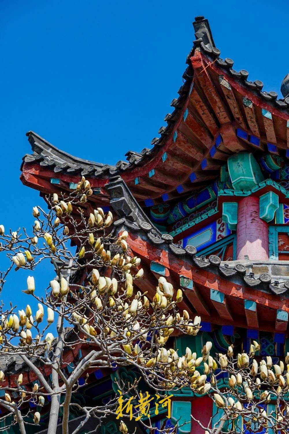 济南大明湖玉兰次第开放 白玉兰含苞伴古建