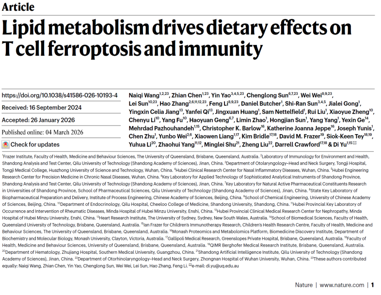 国际顶级学术期刊Nature在线发表了齐鲁工业大学(山东省科学院)与澳大利亚昆士兰大学等联合开展的一项针对膳食脂质代谢调控T细胞功能与免疫反应的研究成果,题为“Lipid metabolism drives dietary effects on T cell ferroptosis and immunity”。与齐鲁工业大学(山东省科学院)有十余年深入合作的澳大利亚健康与医学科学院院士余迪教授为通讯作者,王乃琪博士、孙成龙研究员、张浩副研究员为论文共同第一作者。这是继研究团队与余迪教授合作在Nature Medicine(2016)、Nature Immunology(2016)、Nature Reviews Rheumatology (2019)、Nature Immunology(2021)等CNS论文之后发表的又一重大研究成果。
