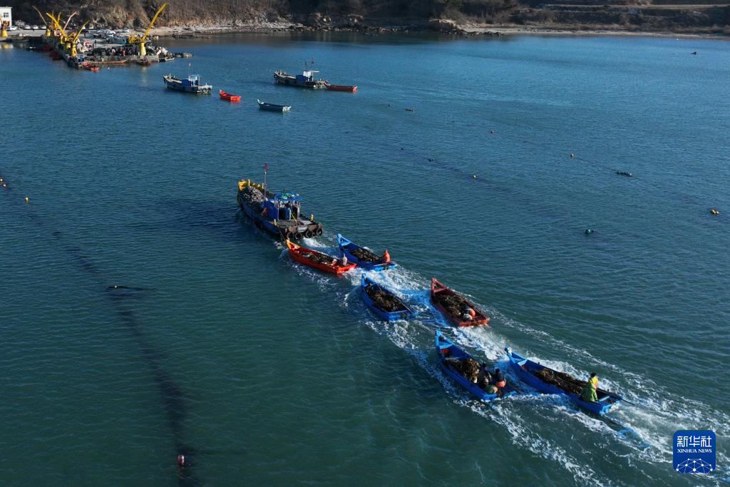 眼下,在我国海带主产区山东省荣成市,海洋牧场海带养殖区一派繁忙景象。养殖户对近岸养殖区达到成熟标准的海带分批收割,为后期收割的海带留出生长空间,以便提高海带产量和质量。3月9日,在山东省荣成市爱伦湾海洋牧场,满载海带的养殖船驶往码头(无人机照片)。新华社发(王福东摄)