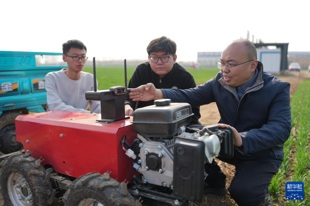 春耕农忙时节,在山东省肥城市安驾庄镇洼里无人智慧农场内,由山东农业大学团队自主研制的智能农机装备在田间穿梭,助力春耕生产。3月9日,山东农业大学副教授陈国庆(右)和团队成员在调试农田作业通用机器人。新华社记者 朱峥 摄
