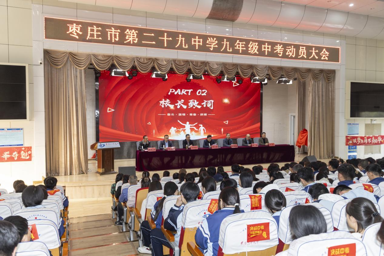 3月12日下午,枣庄市第二十九中学举行2026年中考百日动员大会,校领导、九年级全体师生及家长代表参会,为中考冲刺凝心聚力、吹响号角。