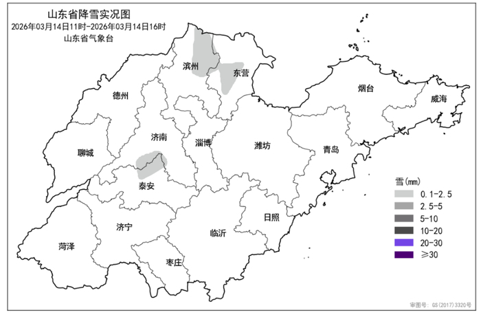 在13日20时至14日16时的降雪统计中,泰安泰山以1.6毫米的累计降雪量继续位居全省首位,东营垦利(0.4毫米)和滨州沾化(0.3毫米)也有少量降雪记录。