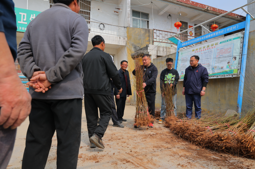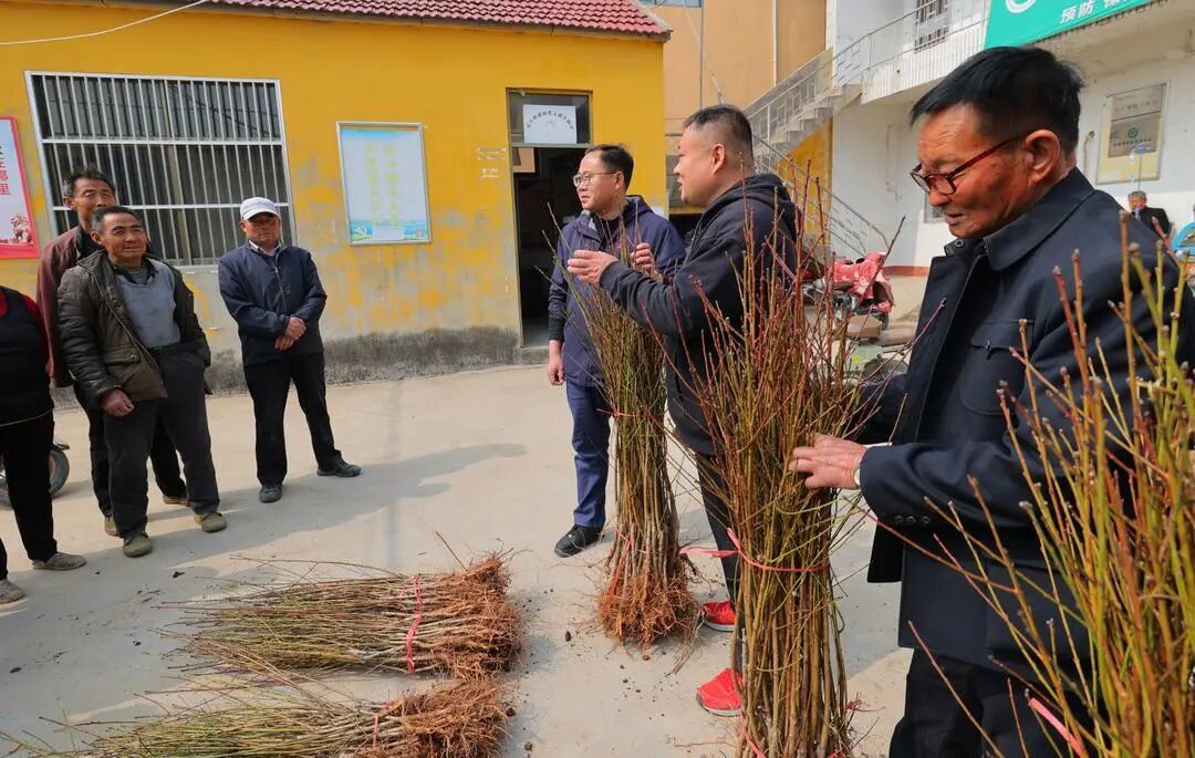 发放现场,电商党支部的成员们还耐心讲解栽植要点,解答农户关于品种特性、水肥管理、修剪整形等技术疑问。