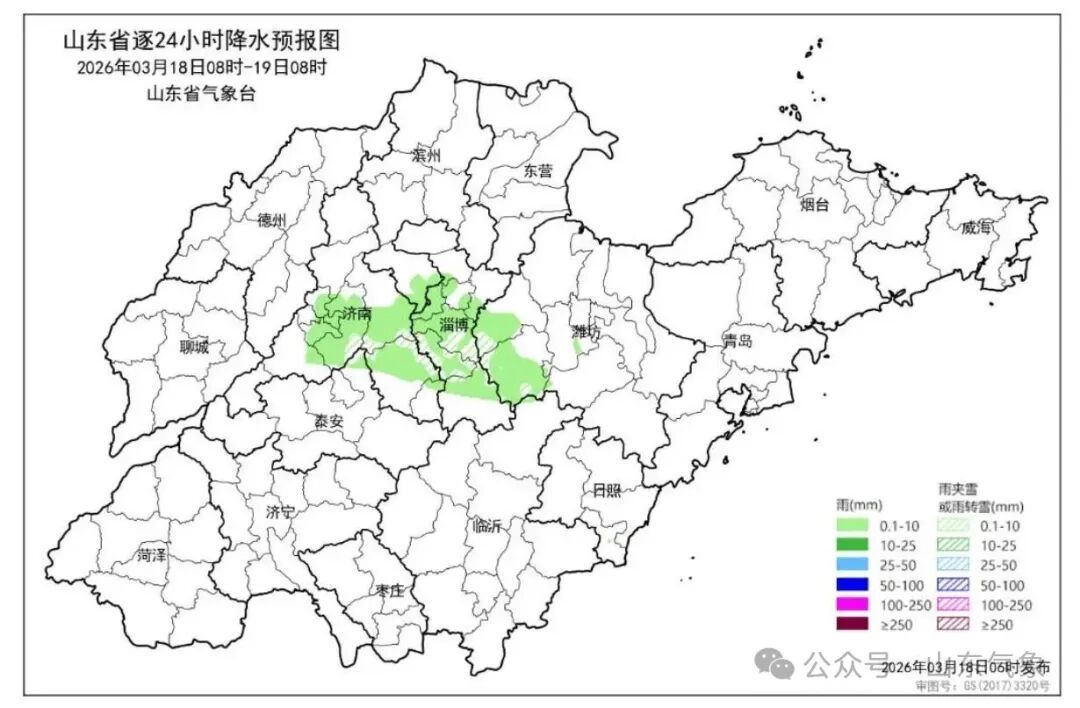 18日白天到夜间,鲁中地区天气阴局部有小雨转晴,其他地区天气多云转晴;18日早晨,聊城和鲁南的部分地区有雾或轻雾。鲁西北、鲁中、半岛地区和内陆湖面北风5~6级阵风7~9级转南风3~4级,其他地区北风4~5级阵风6~7级转南风3~4级。夜间最低气温:鲁中山区和半岛内陆地区-3°C左右,其他地区-1°C左右。最高气温:东营、烟台、威海和鲁中山区7°C左右,其他地区11°C左右。