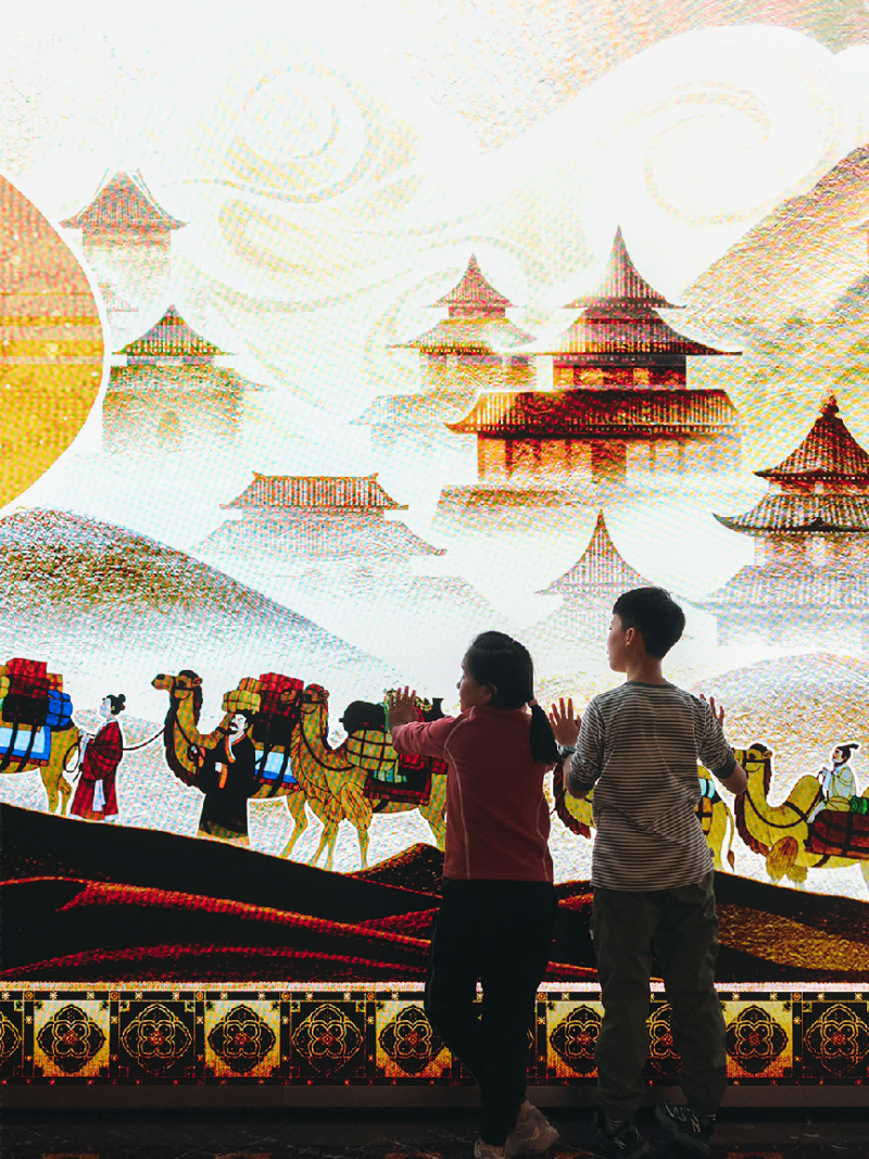 前厅的穹顶用了多媒体装置,展示数码艺术作品《丝路沙痕》。风蚀的痕迹像时间的刻刀,形成层叠的岩石纹理,凝固了中西文明交汇的历史。