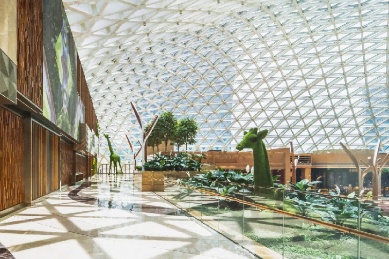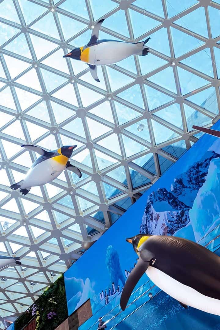 广场内不仅拥有种植超过10万株植物的“自然之艺”室内花园,更令人称奇的是每日定时上演的“空中海洋秀”。在全球面积最大的室内LED屏幕背景下,巨大的鲸鱼、海豚(或根据季节变换的企鹅等海洋生物)仿佛在头顶的空中悠然游过,配合逼真的光影效果,让你仿佛置身于神秘的海底世界。
