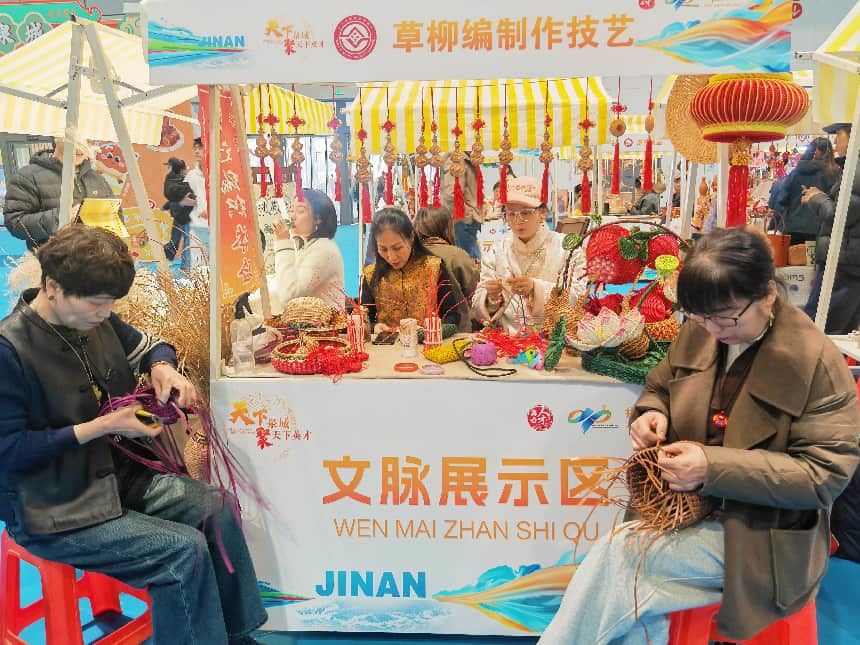 会场一角,“文脉・济南”文化展示专区里,手艺匠人们正现场制作着草柳编,柳条在她们手中来回翻飞,成了这热闹会馆中的安静一隅。工作人员说,这是想让外地来的求职者对济南有个直观的印象,这里不只是工作的地方,也是可以安逸生活的地方。