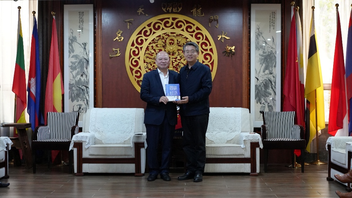 张晓峰将自己的著作《智能经济》赠送给苏勇先生