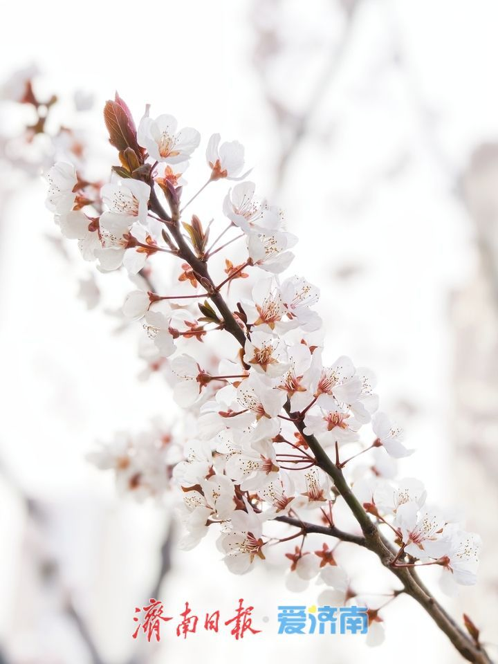 济南腊山河西路道路两侧的数百株紫叶李迎来盛花期,进入最佳观赏时段,粉白相间的花朵缀满枝头,犹如一条粉色丝带缠绕道路两侧,将西城装扮得浪漫又清新。(济南报业全媒体)