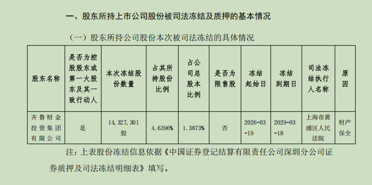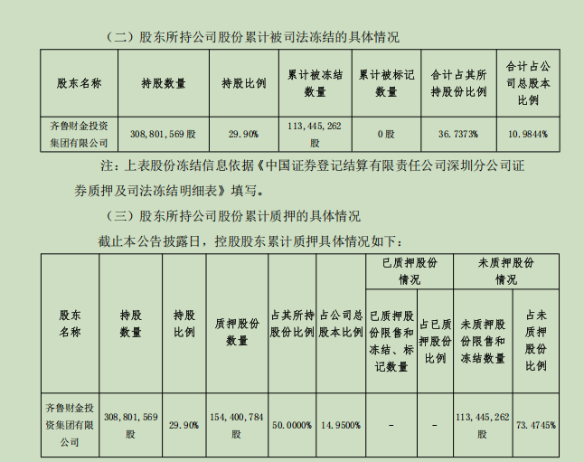 作为常铝股份控股股东,齐鲁财金近年来所持上市公司股份多次出现质押、冻结情形。截至3月21日,齐鲁财金累计质押股份及被司法冻结股份数量(含本次)占其所持常铝股份股份数量比例超过80%。