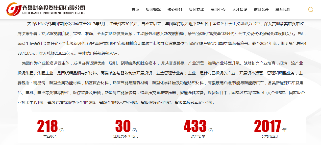 公开资料显示,齐鲁财金成立于2017年,截至2024年底,其资产总额433.41亿元,收入总额218.12亿元,主体信用等级评级AA+。