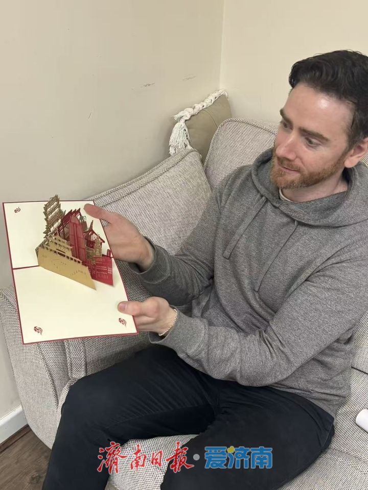 随后,他向大家展示了独具济南特色的立体贺卡,贺卡浓缩了山泉湖河城的泉城风貌,精巧别致。他将这份承载着济南心意的文创礼物赠送给在场友人,让大家通过小小贺卡,近距离感受济南的城市之美。