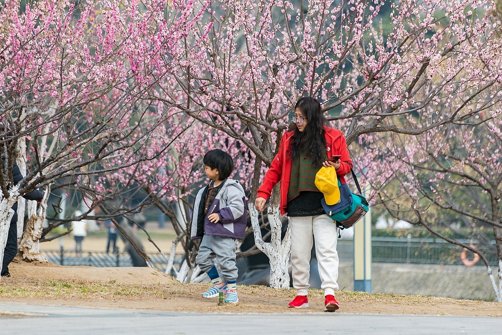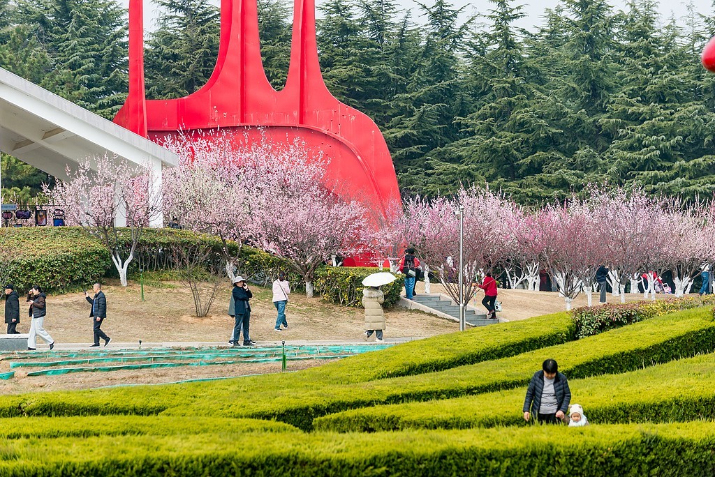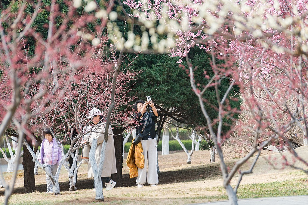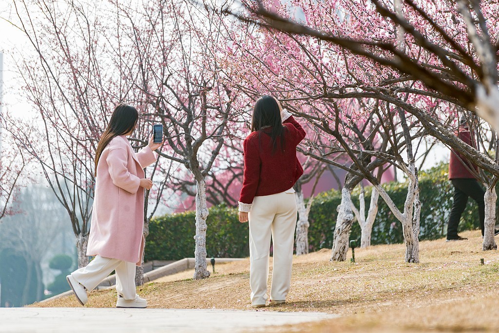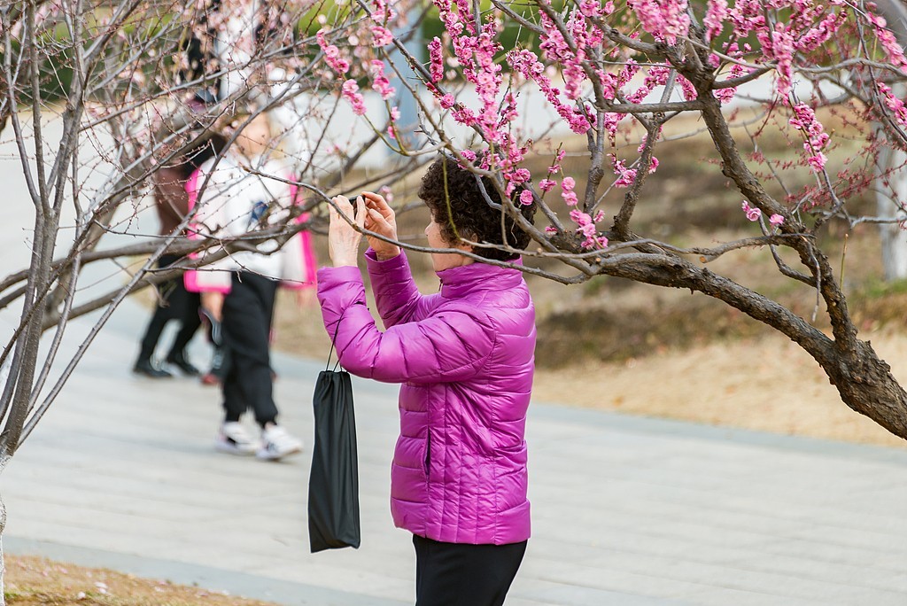 近日,临沂,雕塑公园梅花盛开,市民纷纷前来赏花拍照,踏青春游。
