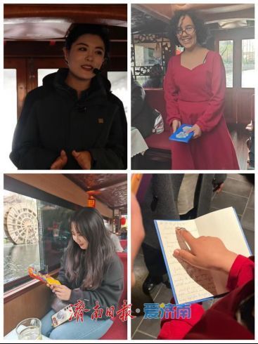 下午四点,嘉宾们登上游船,从黑虎泉出发,开启了环游护城河的旅程。游船缓缓穿行于碧波之上,串联起解放阁、黑虎泉、泉城广场、趵突泉、五龙潭、大明湖等泉城地标。与以往不同,本次游船讲解迎来了一位特别的“泉城讲述者”——来自摩洛哥的青年国际文旅志愿者诺海拉(Nouhaila)。她用流利的中文和母语,结合自身在济南生活的经历,为中外友人带来了生动而亲切的中英双语讲解。从解放阁的红色记忆到黑虎泉畔的市井生活,从趵突泉的三股水到水闸的水利智慧,诺海拉和天下第一泉风景区工作人员辛汶静配合讲解,让古老的泉水故事在“国际之声”中焕发出新的活力。