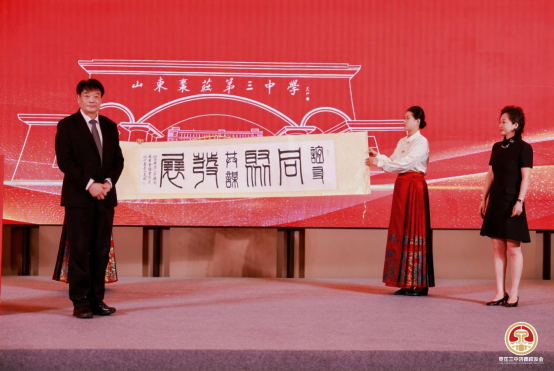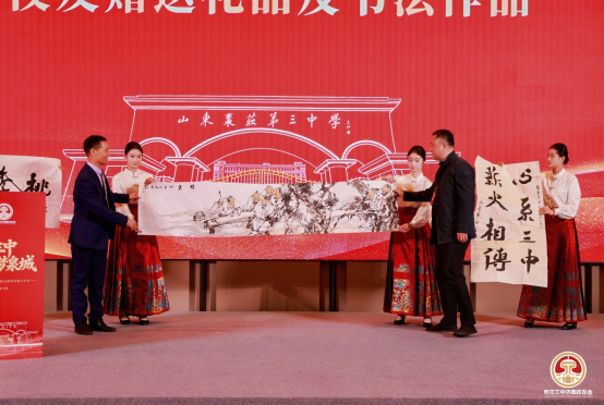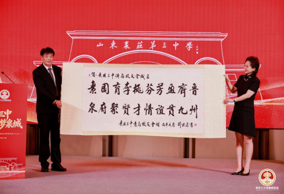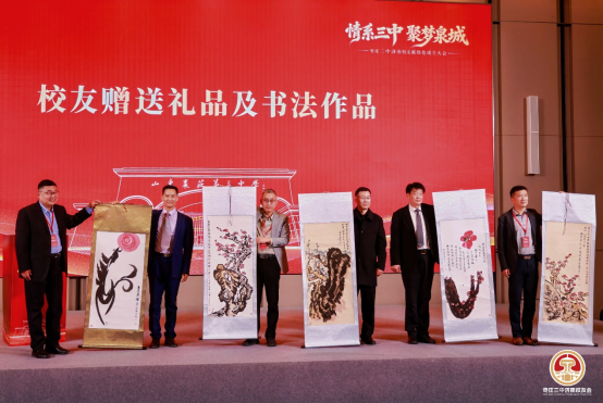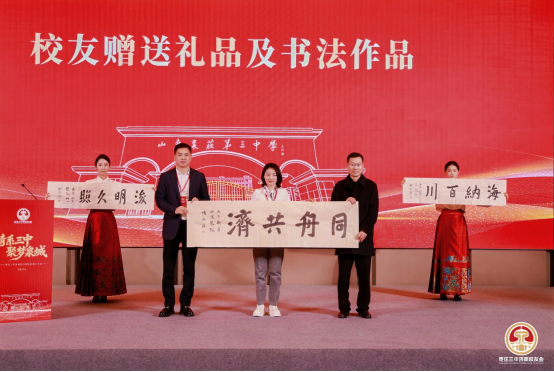 大会还设置了充满文化底蕴与校友情谊的环节,北京、青岛、枣庄、长三角、大湾区枣庄校友会代表专程到场,向济南校友会赠送纪念礼品,传递各地校友的美好祝福,彰显三中校友同心同德、薪火相传的精神。书法家校友陆宪磊现场挥毫泼墨,赠送书法墨宝,以笔墨寄情,书写校友情、母校恩,为大会增添了浓厚的文化氛围。