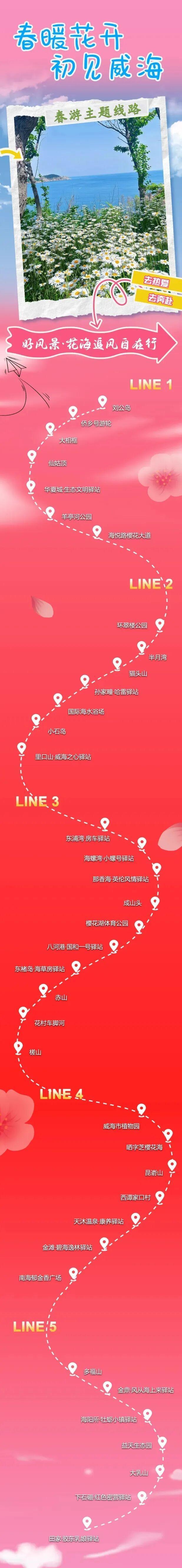 Line4:威海市植物园——晒字芝樱花海——昆嵛山——西谭家口村——天沐温泉·康养驿站——金滩·碧海逸林驿站——南海郁金香广场