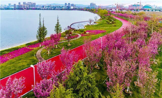 四五月的樱花湖体育公园,环湖花影摇曳,粉白交织的繁花缀满枝头。微风拂过,花瓣如雪纷扬,在湖面上轻盈旋舞。徜徉其间,连呼吸都染上清甜的气息,让人沉醉在这片温柔的春色里。