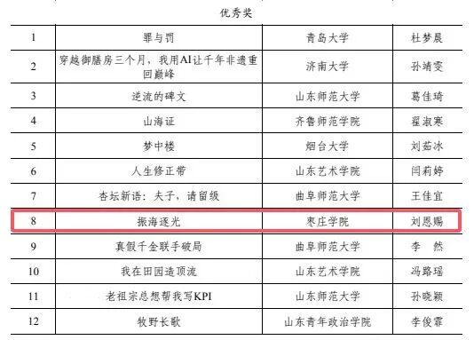 3月27日,“微剧汇才 创领未来”首届山东省高校大学生微短剧剧本创作大赛颁奖仪式在浪潮青岛大数据产业园成功举办,枣庄学院光电工程学院刘恩赐同学的作品《振海逐光》获大赛优秀奖,枣庄学院荣获“优秀组织奖”。