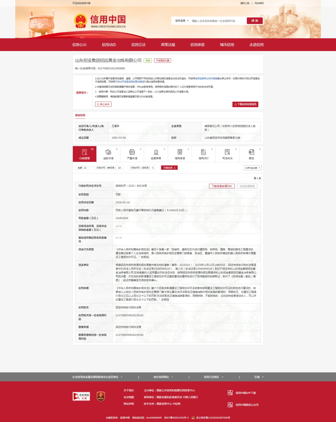 凤凰网山东(报料微博@凤凰网山东)日前从信用中国行政处罚栏获悉,3月16日,山东招金集团旗下的山东招金集团招远黄金冶炼有限公司(下称“山东招金黄金冶炼公司”)因未取得建设工程规划许可证擅自建设,被招远市综合行政执法局处以104029.14元罚款。