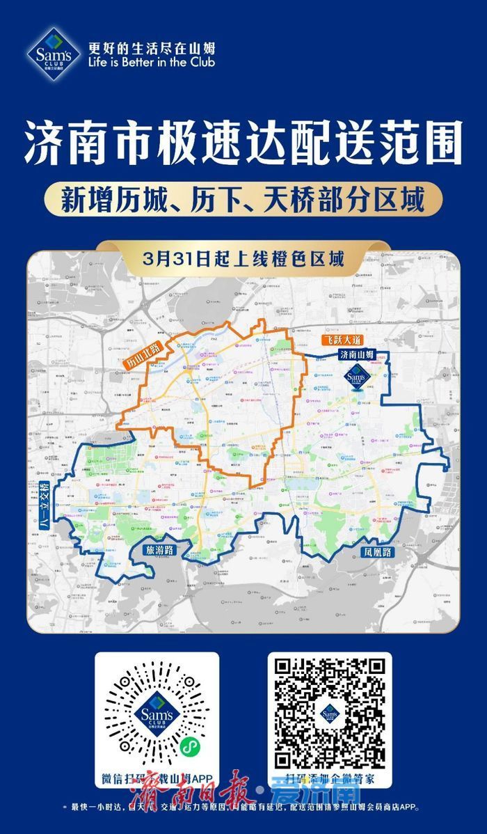 3月31日起,济南山姆“极速达”配送范围再次扩大。继历下、市中、高新部分区域率先上线后,历城、天桥部分区域正式纳入配送版图。更多济南市民将足不出户,通过山姆APP线上下单,即可享受最快1小时送达的便捷购物体验。