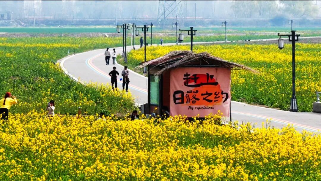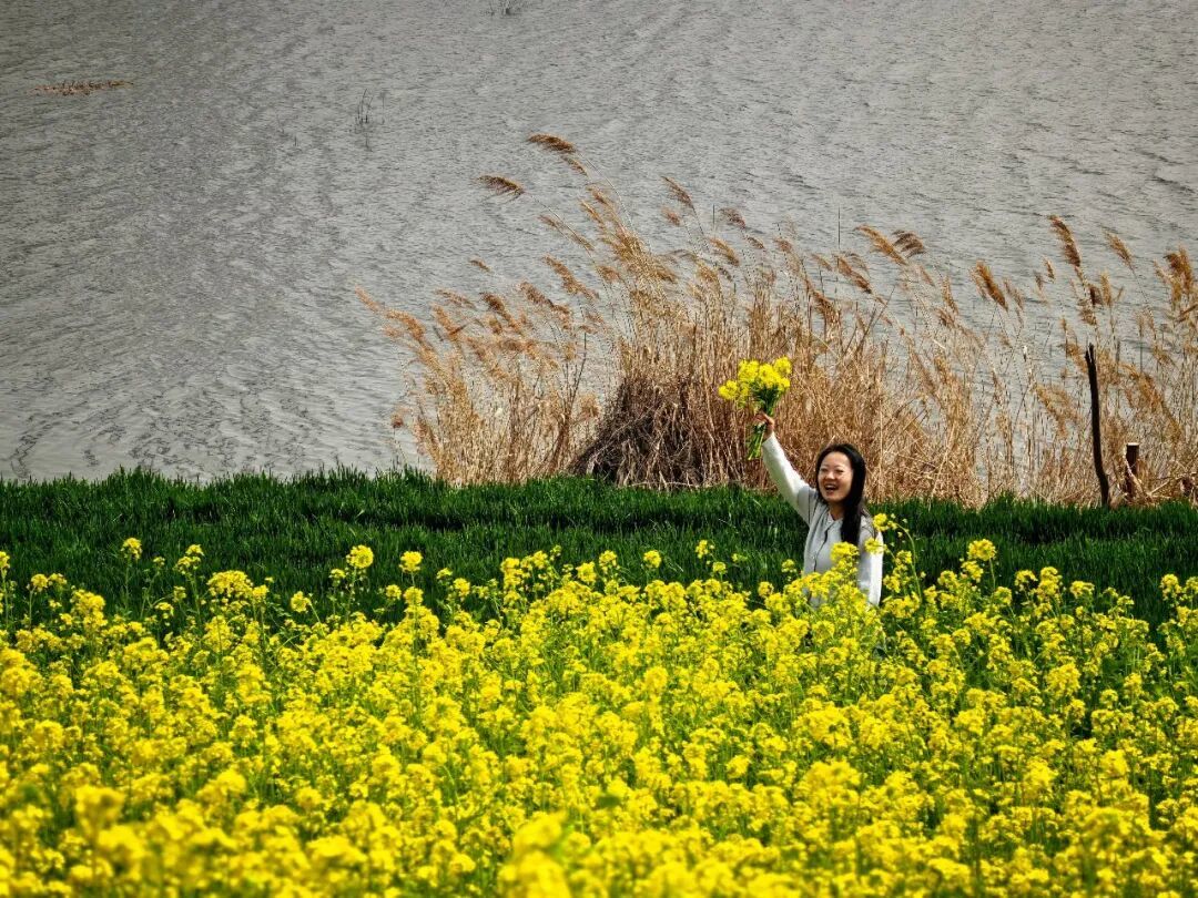 蟠龙河畔的油菜花田迎来盛花期,一片金黄铺展在河两岸,宛如金色的绸缎覆盖大地。阳光下,油菜花田层层叠叠、错落有致,蜂蝶穿梭其间,与潺潺河水构成一幅灵动的田园画卷。不少游客带着孩子在花田边的步道上嬉戏,有人支起帐篷享受春日野餐时光,还有人用镜头定格金黄花海与碧水蓝天的绝美瞬间,尽情享受春日的松弛与惬意。