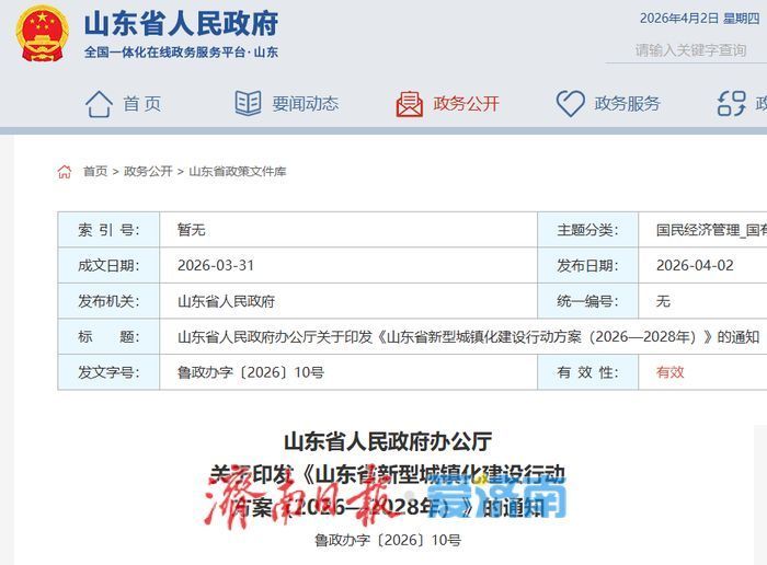 城镇化是现代化的必由之路。此次《山东省新型城镇化建设行动方案(2026—2028年)》在全面系统评估新型城镇化建设前两年行动方案基础上,明确了今后三年全省新型城镇化发展思路、重点任务、保障措施。《行动方案》总体分为六部分、18条,其中明确了15项重点任务和3条要素保障措施。