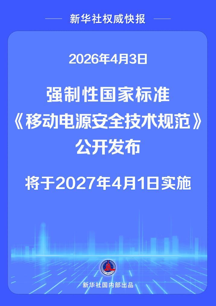 2026年4月3日,强制性国家标准《移动电源安全技术规范》公开发布,将于2027年4月1日实施。新标准提出多项要求,进一步强化包括充电宝在内的移动电源产品安全水平——