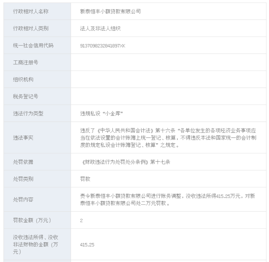 日前,信用中国(山东新泰)网站公布的一条行政处罚信息显示,新泰恒丰小额贷款有限公司因违规私设“小金库”,被新泰市财政局责令进行账务调整,没收违法所得415.25万元,并处罚款2万元。处罚决定日期为2026年4月1日。
