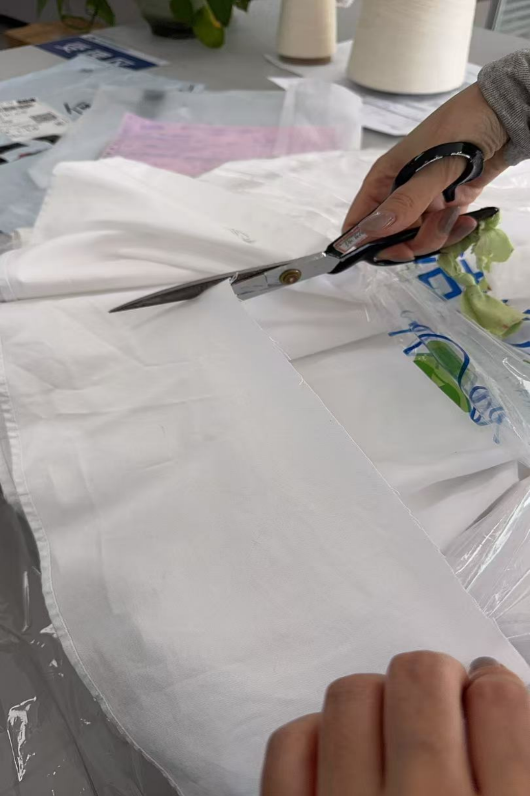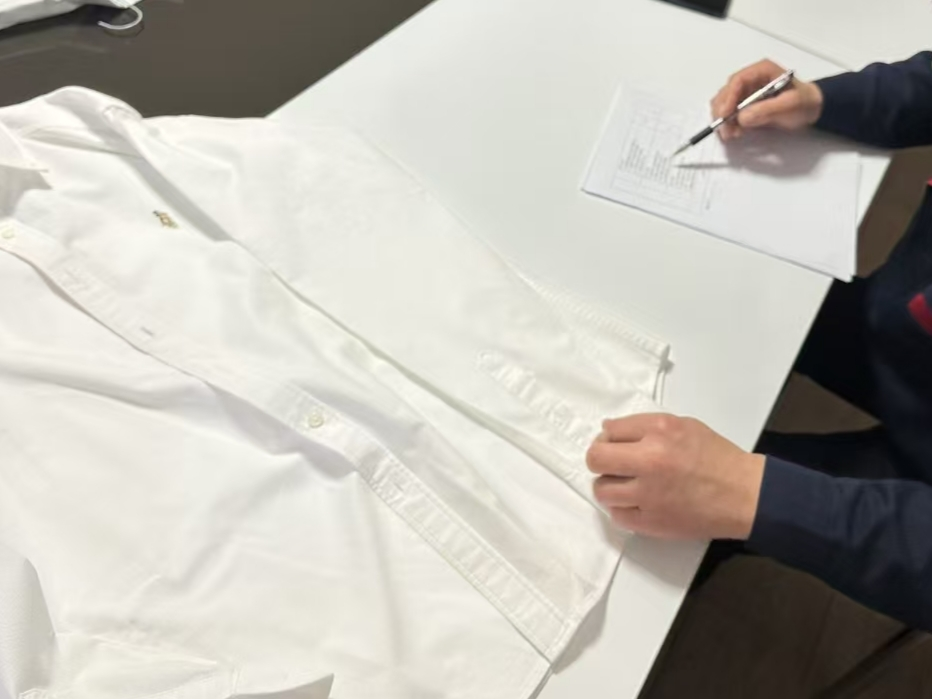 (三)还原衣物剐蹭破损。用剪刀按照统一标准对衬衫下摆边缘进行剪角破坏,模拟衣物日常穿着中因剐蹭、拉扯导致的局部破损场景,以此校验洗衣店在接收环节的破损标注完整性,以及服务全流程中对衣物破损情况的责任追溯与风险规避能力。