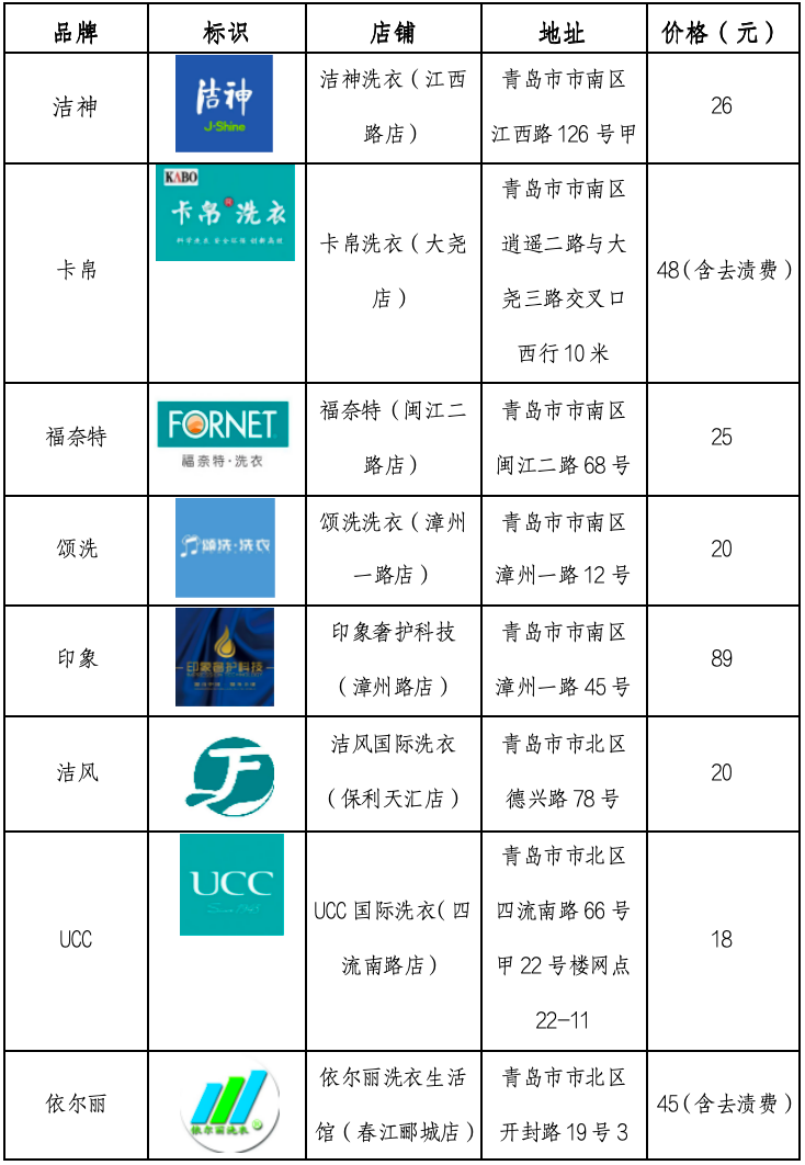 15家洗衣店地址和洗衣价格:
