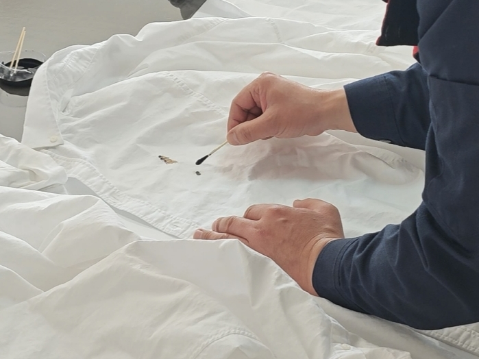 (一)模拟墨汁污渍。在白色衬衫显著位置和隐蔽处,定量点染2处黑色墨汁,模拟消费者日常办公、学习过程中不慎沾染的墨汁类顽固污渍,确保污渍清洗效果评测的公平性与可比性。