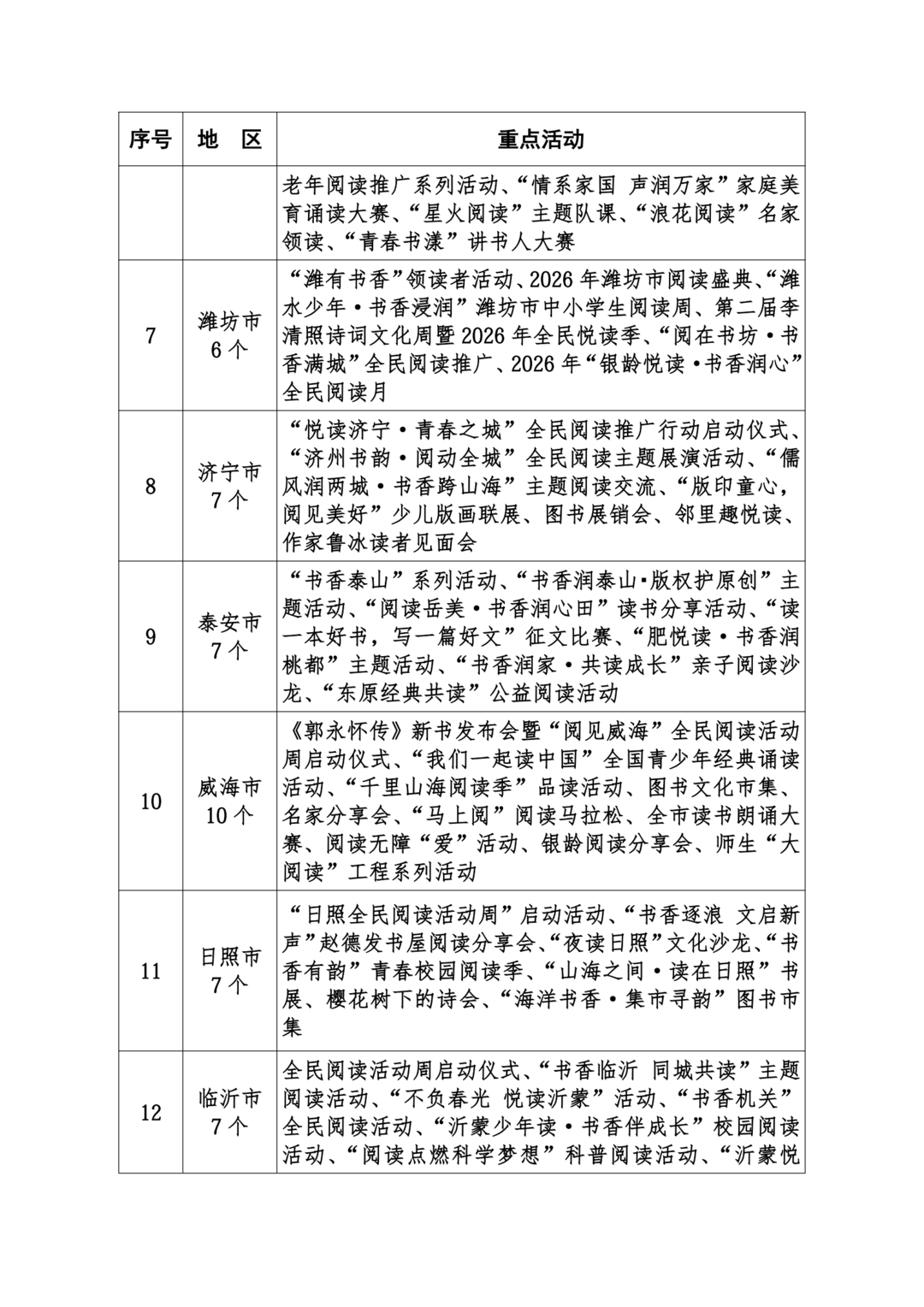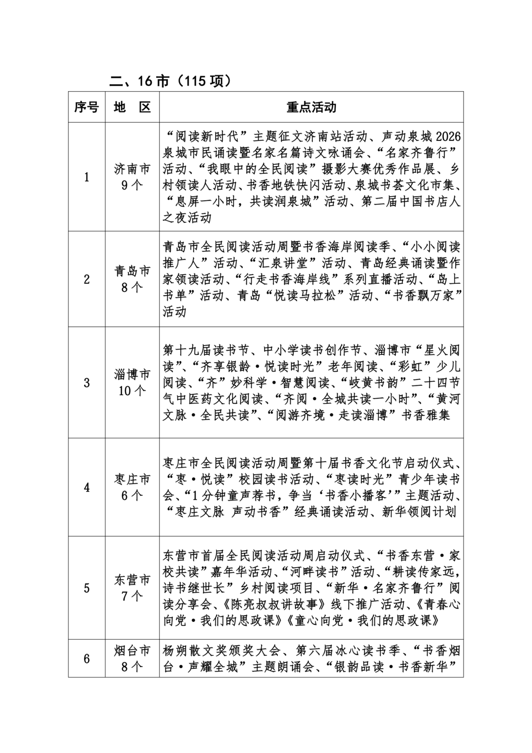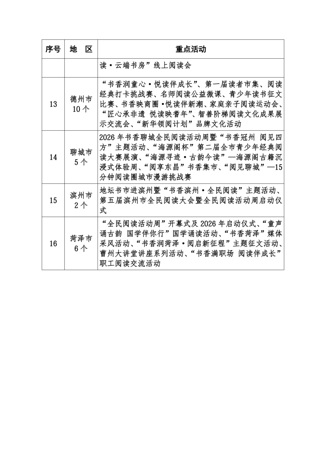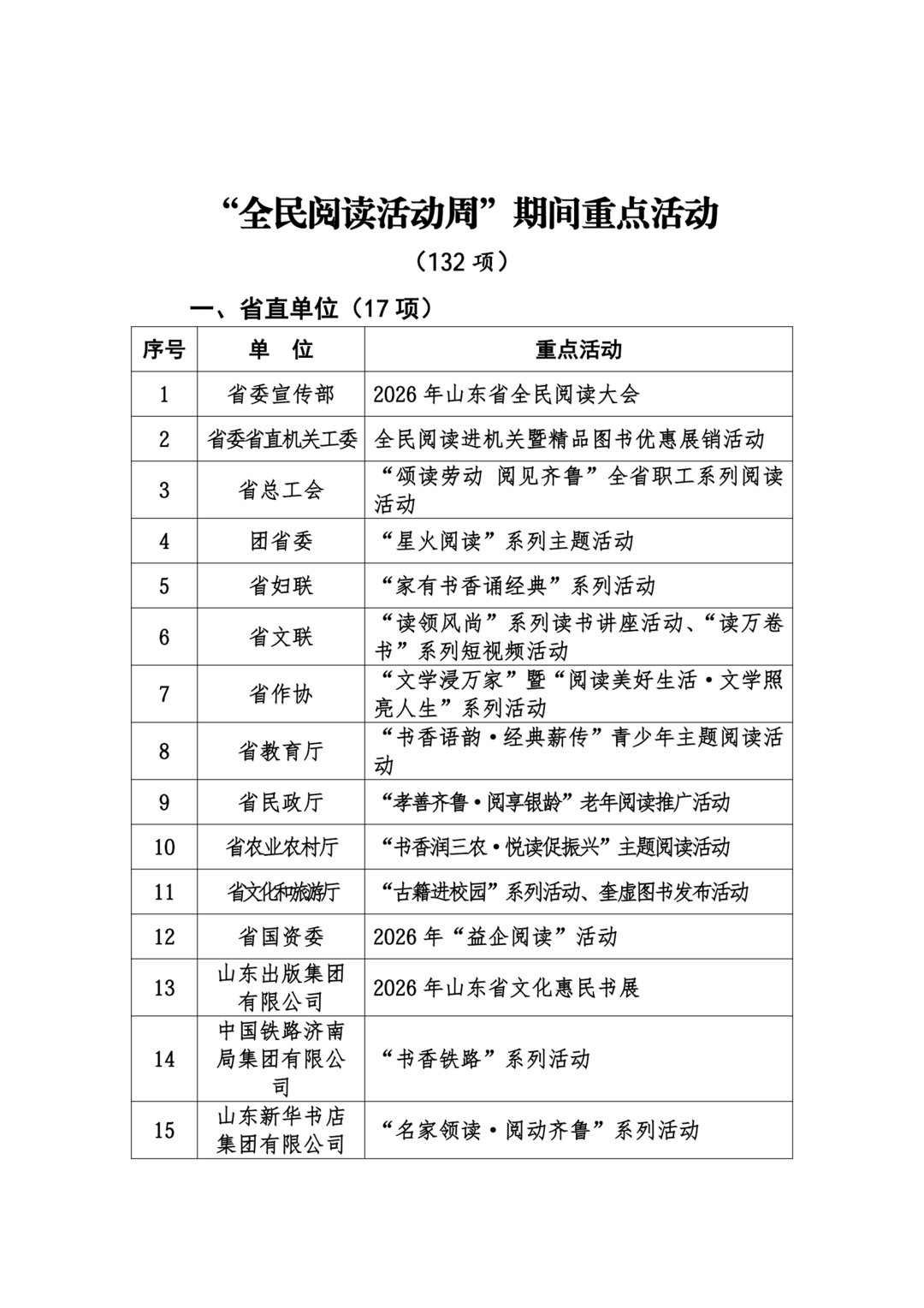除了2026年山东省全民阅读大会,全民阅读活动周期间,我省还将开展132项阅读推广活动(详细安排见文末),包括:全民阅读进机关暨精品图书优惠展销活动,“颂读劳动 阅见齐鲁”全省职工系列阅读活动,“星火阅读”系列主题活动,“家有书香诵经典”系列活动,“读领风尚”系列读书讲座活动、“读万卷书”系列短视频活动,“文学浸万家”暨“阅读美好生活·文学照亮人生”系列活动,“书香语韵·经典薪传”青少年主题阅读活动,“孝善齐鲁·阅享银龄”老年阅读推广活动,“书香润三农·悦读促振兴”主题阅读活动,“古籍进校园”系列活动、奎虚图书发布活动,2026年“益企阅读”活动,2026年山东省文化惠民书展,“书香铁路”系列活动,“名家领读·阅动齐鲁”系列活动。