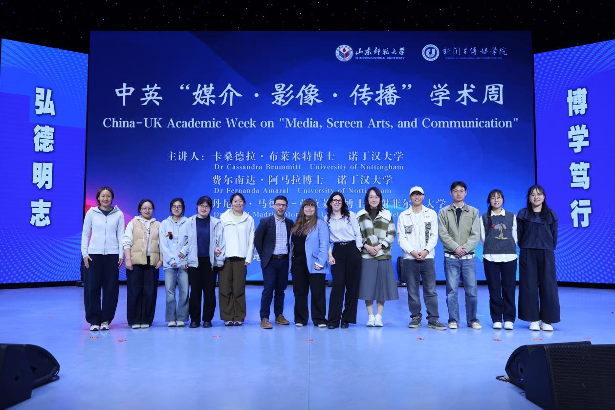 为深化国际学术交流、拓展师生学术视野,助力传媒学科高质量发展,2026年4月7日至10日,山东师范大学新闻与传媒学院成功举办“媒介・影像・传播”中英学术周活动。本次学术周特邀英国谢菲尔德大学、诺丁汉大学三位学者前来交流,以专题讲座、小型学术研讨、学术交流会议等多元形式,围绕数字媒介、影视传播、媒介文化、AI传媒教育等前沿议题展开深度交流,累计开展13场学术活动,吸引校内外师生广泛参与,为学院国际化办学与学科建设注入新动能,开启国际传媒学术交流新篇章。