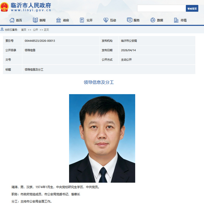 4月14日,山东省临沂市政府网站更新显示,靖涛已任临沂市政府党组成员,市公安局党委书记、督察长。分工为主持市公安局全面工作。
