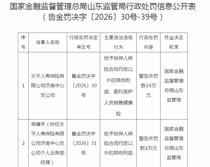 4月9日,国家金融监督管理总局山东监管局对外发布行政处罚信息公开表(鲁金罚决字〔2026〕30号—39 号),太平人寿保险有限公司(以下简称“太平人寿”)济南、泰安、淄博三家中心支公司及7名相关责任人被查处,合计罚款超60万元,多名管理人员及代理人同步被警告并罚款。