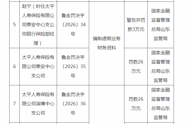 太平人寿泰安中心支公司、淄博中心支公司均因编制虚假业务财务资料,分别被罚款26万元;时任泰安银保部经理、时任淄博银保部经理一同被警告并罚款。